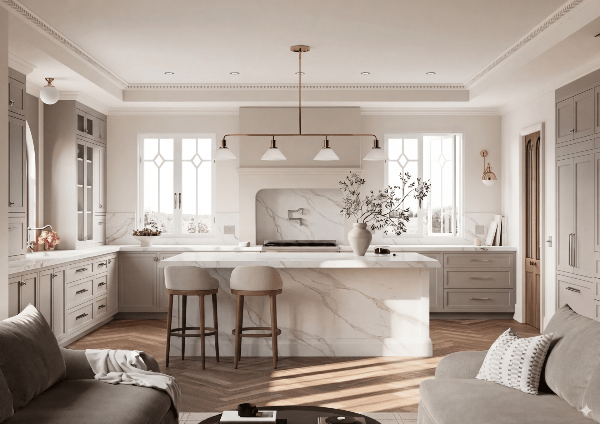 Warmth & Texture: Unlike cold or sterile surfaces, this stone’s creamy palette perfectly complements the rich herringbone wood flooring and the soft, natural light coming through the floor-to-ceiling windows. It proves that quartz can be the "heart" of the home—bringing both durability and visual warmth.