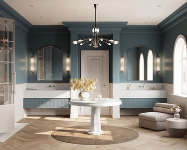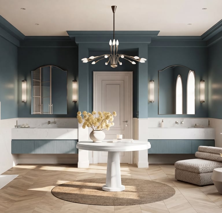 The room is defined by a serene, high-contrast palette of deep teal and warm, natural wood tones. At the heart of this sanctuary sits a stunning, custom-fabricated central quartz pedestal table. Its smooth, matte-finish surface provides a crisp, luminous focal point that draws the eye, perfectly balancing the dark walls and the intricate, light-toned herringbone flooring.