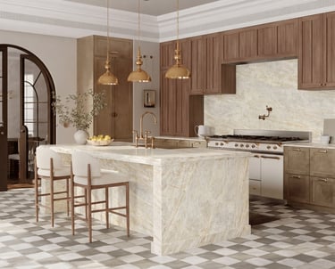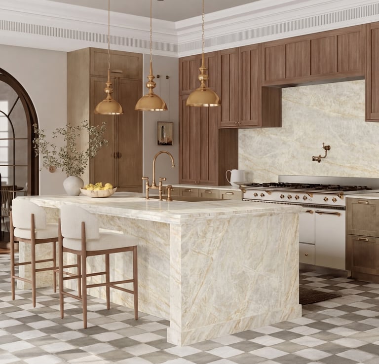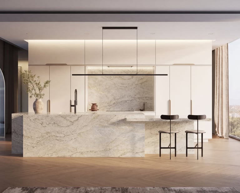 Texture & Lighting: The stone’s polished surface interacts beautifully with the natural light from the windows and the soft, warm glow of the pendant lighting. It doesn't look like a "cold" lab; it looks like a warm, lived-in home where quality materials are treated with care.