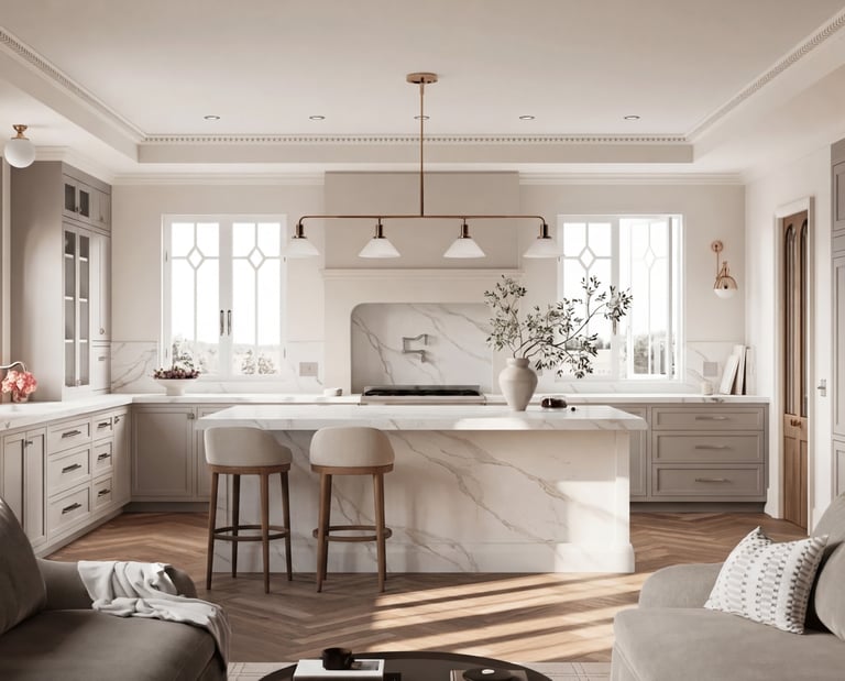 The room leans into a refined, "greige" color palette—blending warm greys and soft creams—which allows the striking veining of the quartz to act as the room’s jewelry. By choosing a quartz with elegant, cascading veins, the design achieves a luxurious feel without being overly busy or dramatic.